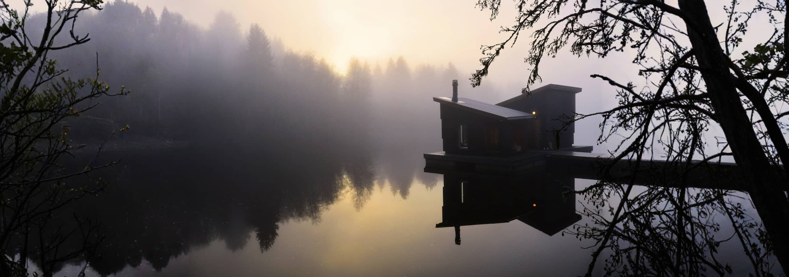 Mørk flytende badstue i tåke med refleksjoner i vann